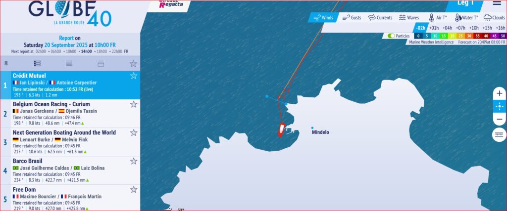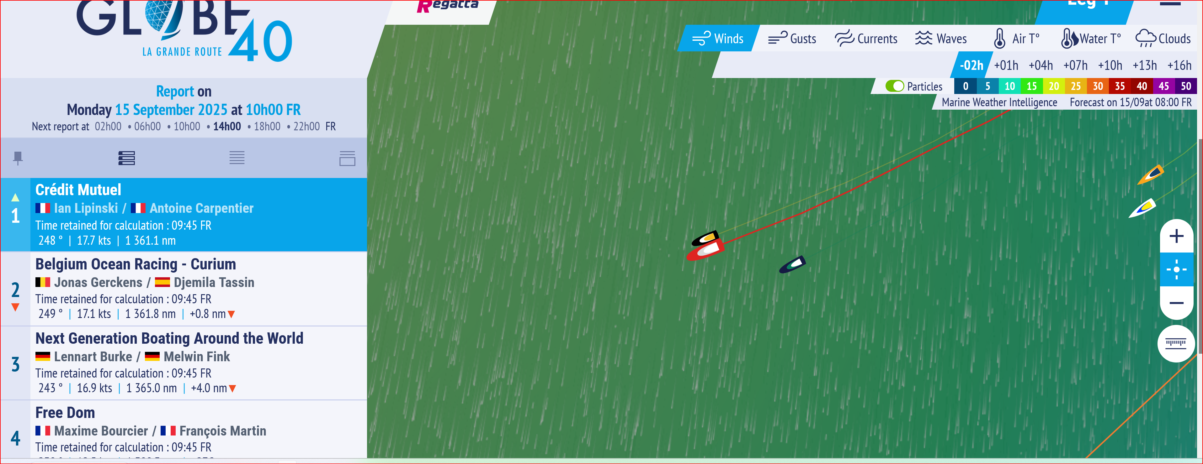 Mo, 12:00 – Ian Lipinski, der sich nach dem Start versegelt hatte, konnte nicht nur mühelos Next Generation sondern auch die Belgier überholen. Er liegt damit – wie im Prolog- auf Platz 1.