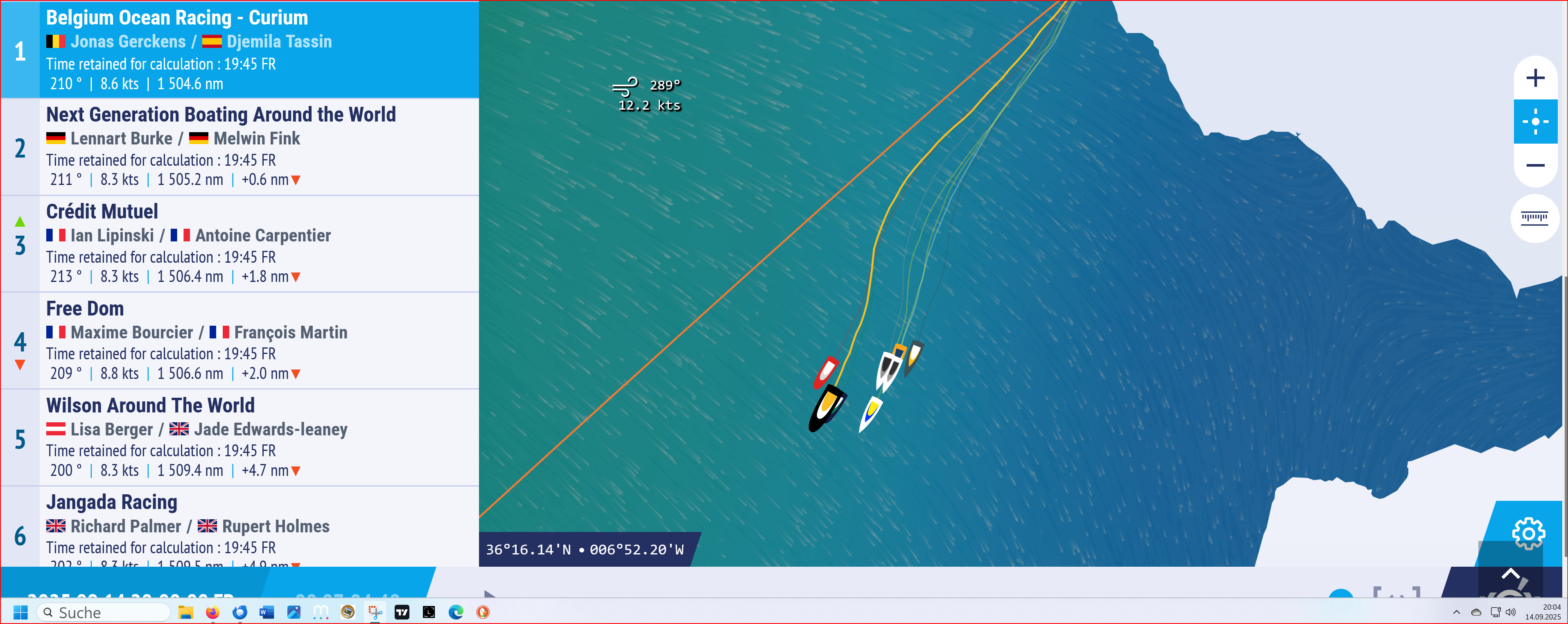 Do. 14:00 – Ian Lipinski’s Speed betrug in den letzten 4 h genau 12,5 Knoten. Next Generation schaffte nur 9,4 Knoten, da man einen Haken schlug. Die Belgier lagen bei 10,4 kn.