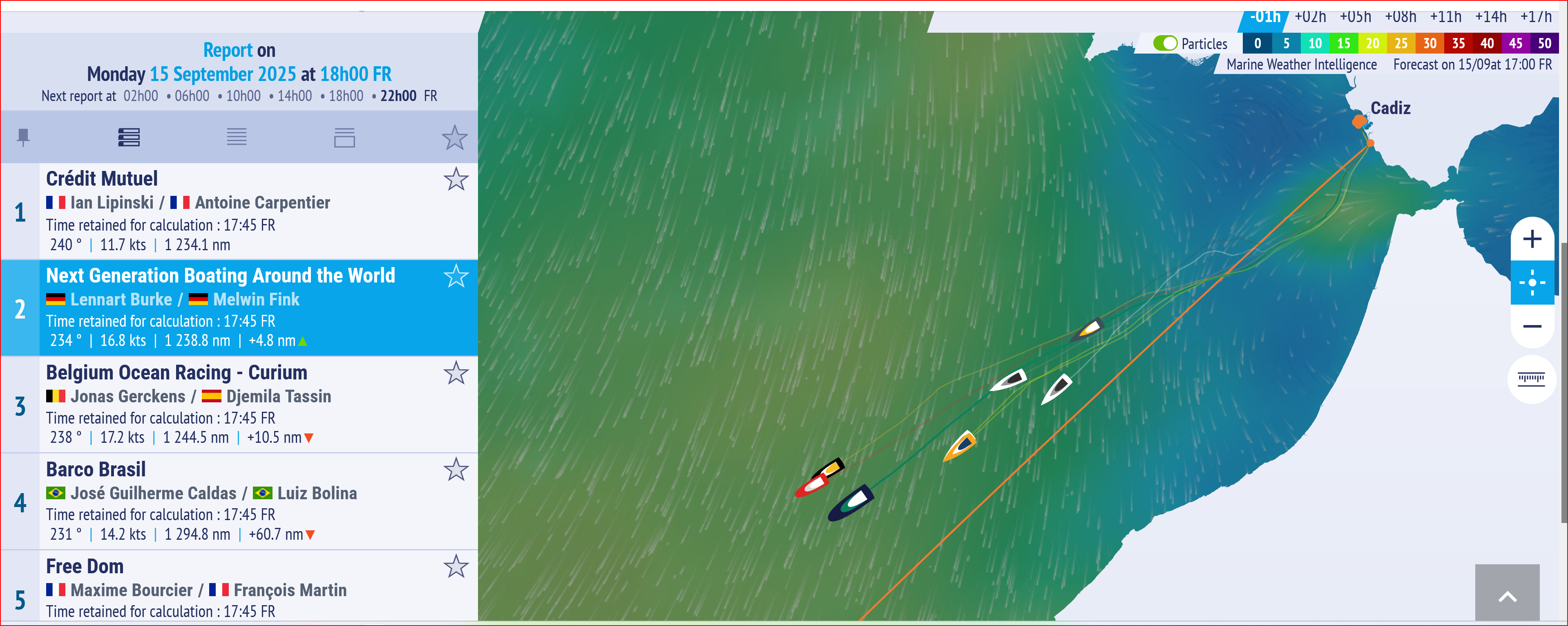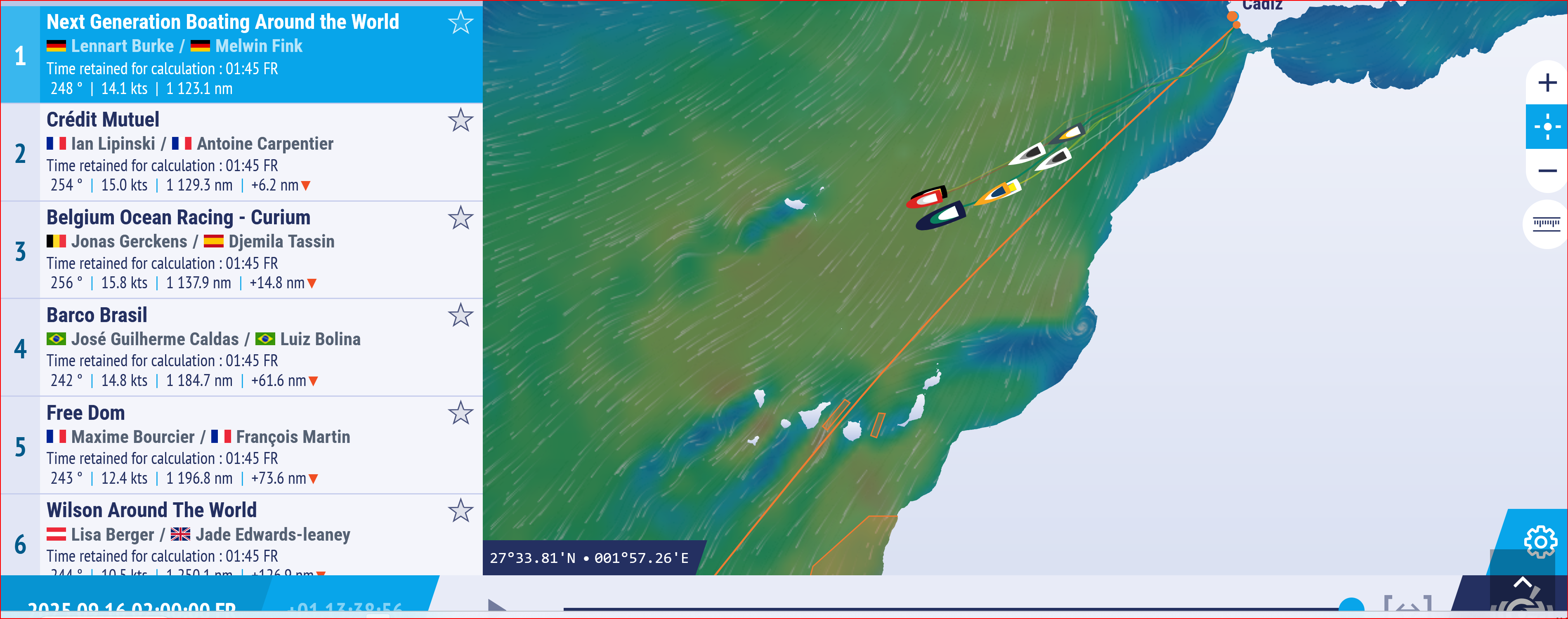 The upcoming leg from Cadiz to Cape Verde is a traditional downwind leg in steady trade winds; with a passage between the Canary Islands, which always holds surprises given the influence of the terrain on the winds; in principle, therefore, a great downwind glide, a point of sail at which the German crew demonstrated remarkable speed during the prologue and is therefore the favorite for this first official leg. But the experience of the French team and the motivation of the Belgian team will certainly not leave the field open to the ambitions of the young ex-Ministers from across the Rhine. Among the top teams, FREE DOM (No. 139), currently leading the rankings, will also have to fend off the impressive pace of Brazilians BARCO BRASIL (No. 151), the talented Anglo-Austrian WILSON AROUND THE WORLD (No. 93), and the English RORC champions JANGADA (No. 152), not to mention the experience of the first edition of Team Canada WHISKEY JACK (No. 128).