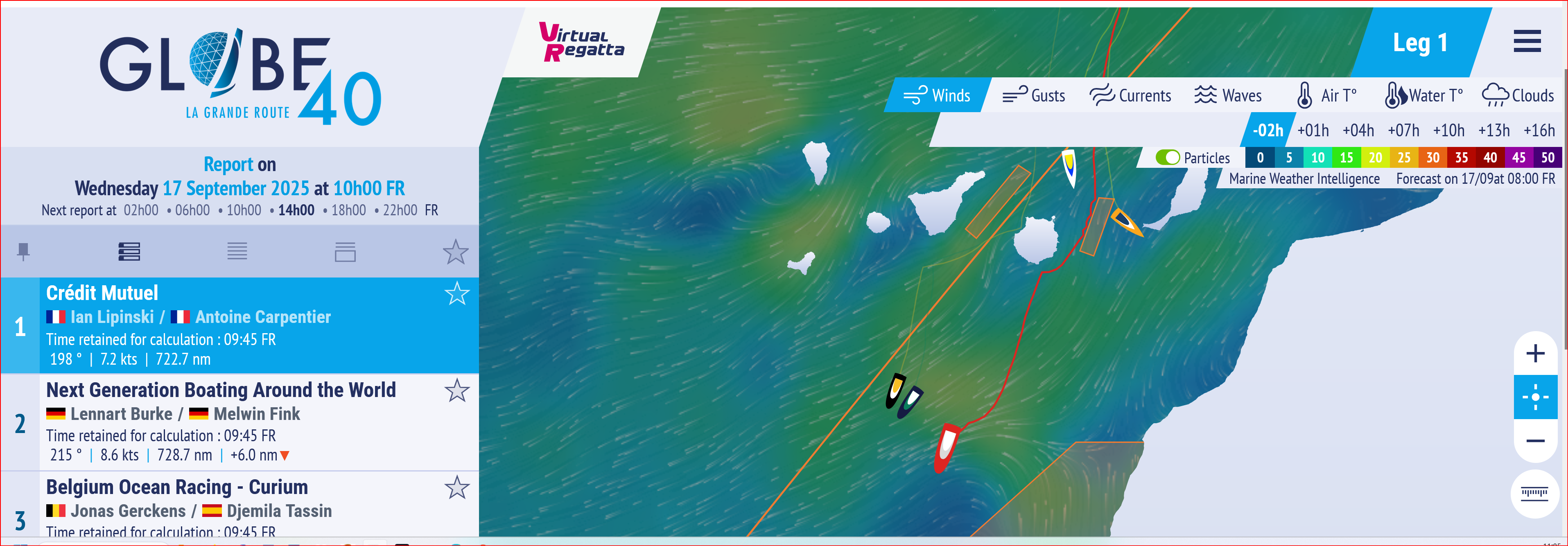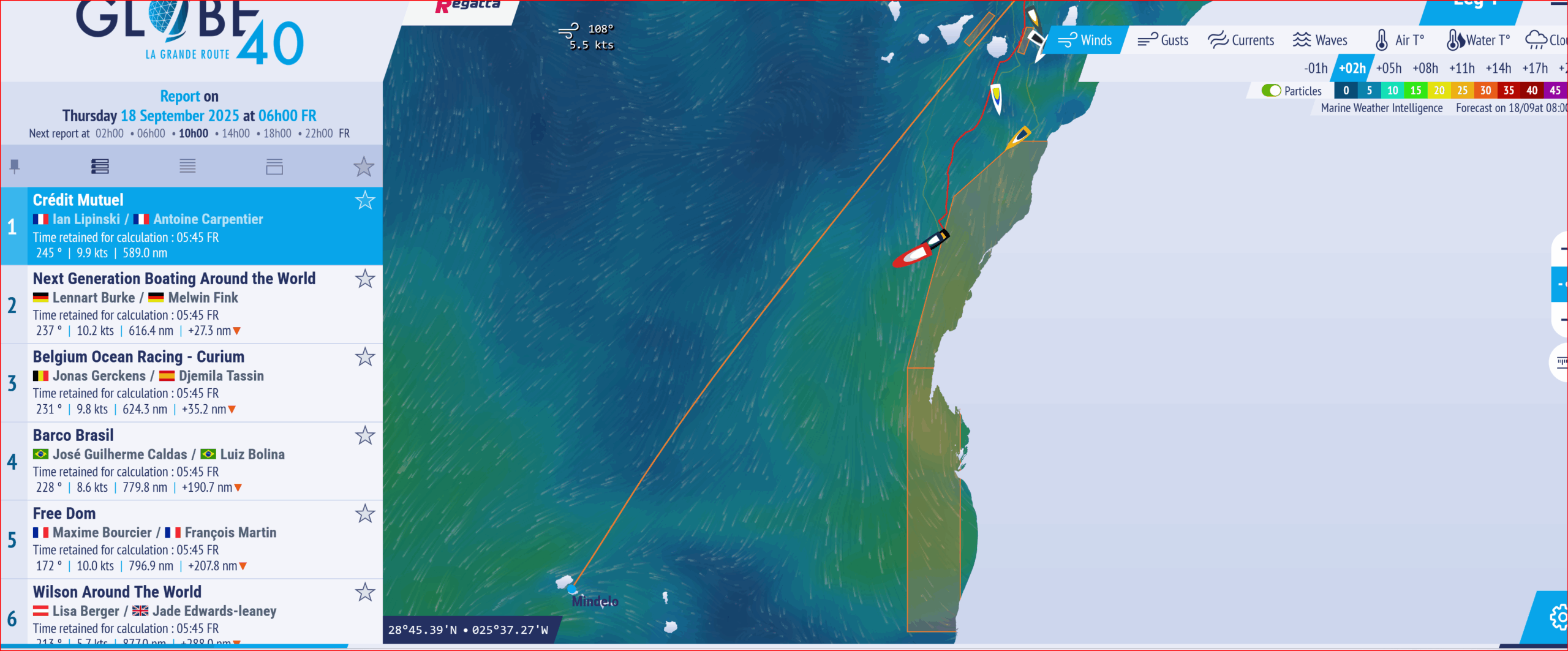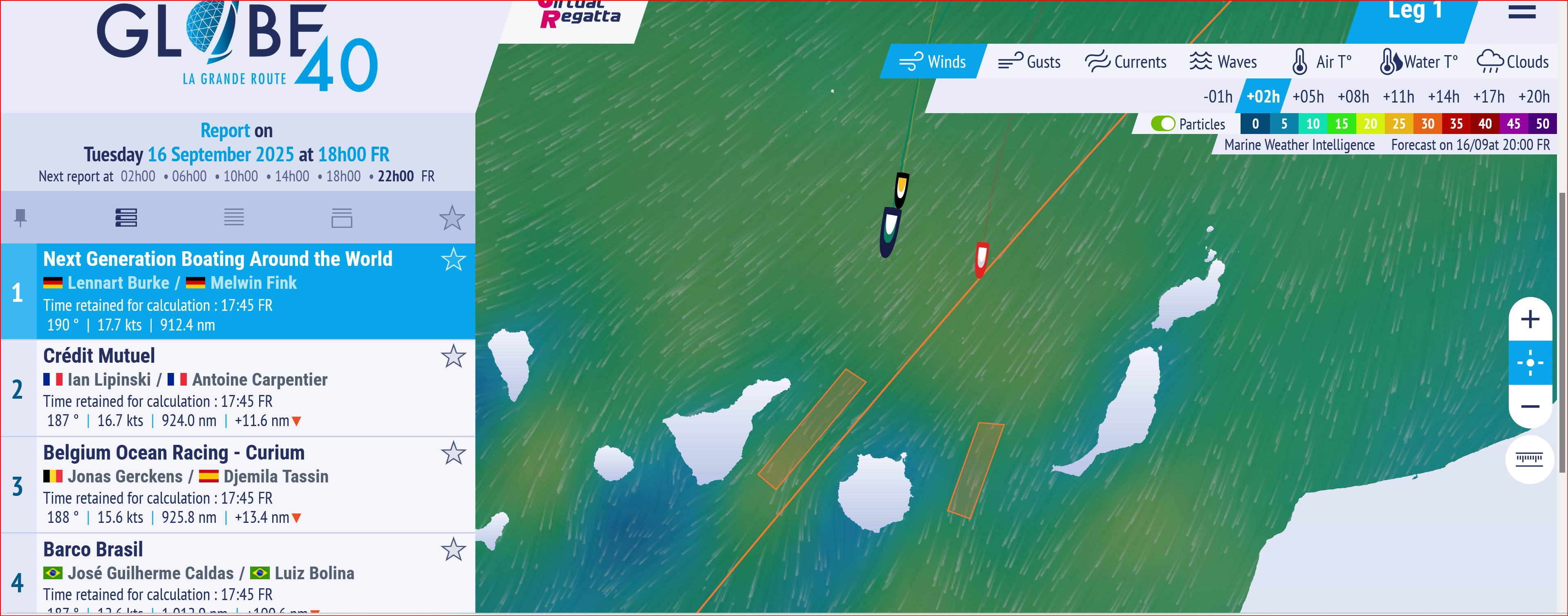 Mi. 10:00 – Leider hatte ich wieder mal Recht. Meine gestern um 18:00 geäusserte Befürchtung ist eingetreten. Unsere Youngster sind auf Platz 2 zurückgefallen, weil Lipinski östlich von Gran Canaria mehr Wind hatte. Allerdings ist es denkbar, dass es zu einem weiteren Führungswechsel kommt, da Lipinski gerade in eine Schwachwindzone hineinsegelt.