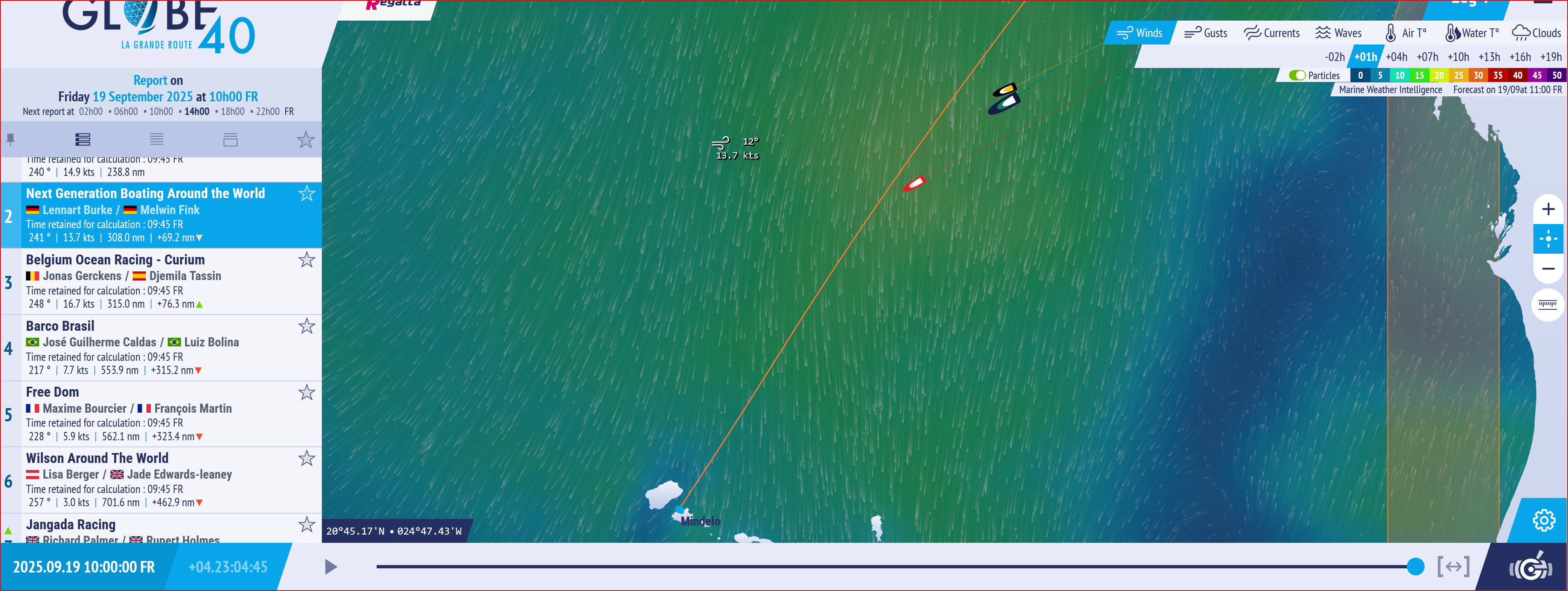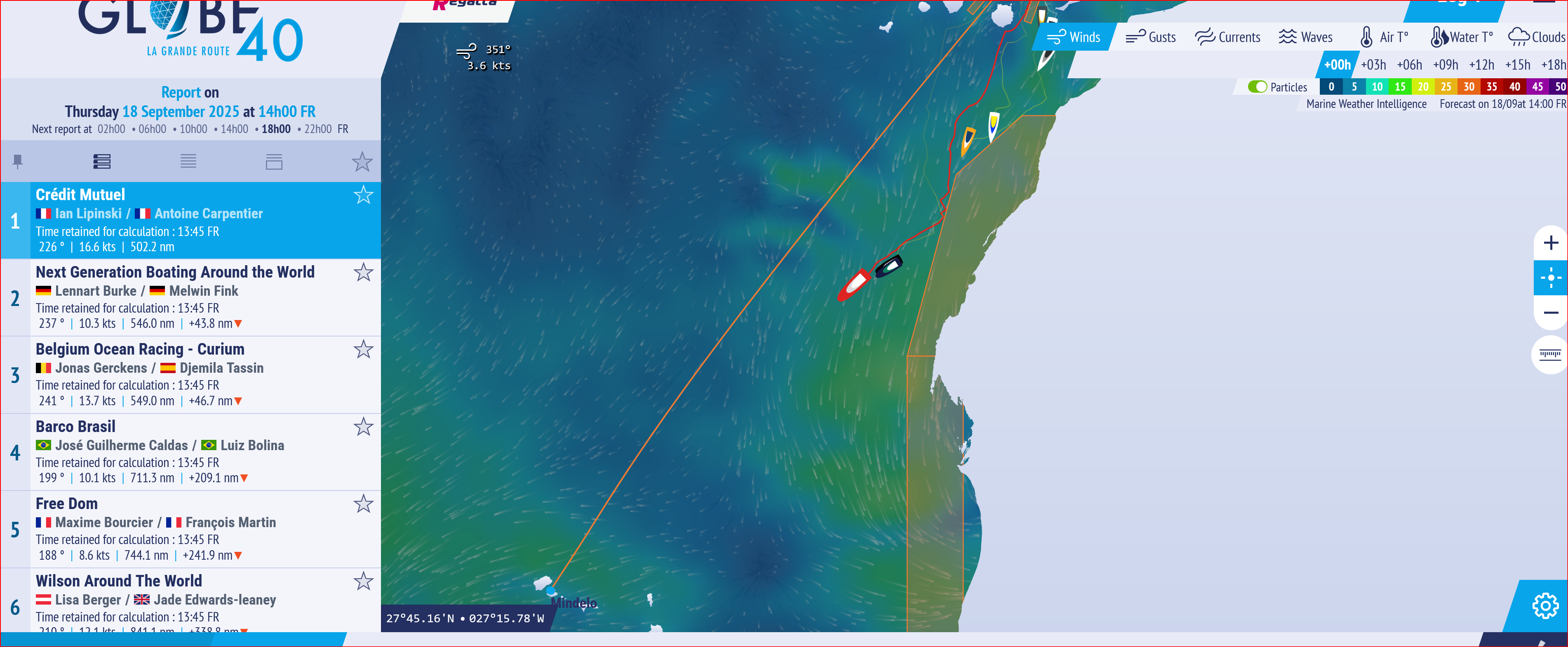 Fr. 18:00 – Der Kurs, den Next Generation gerade eingeschlagen hat, sieht leider gar nicht gut aus, denn er führt direkt in die Flaute. Laut Tracker sind sie bereits auf Rang drei abgerutscht. Ian Lipinski macht dagegen alles richtig. Er segelt gewissermassen in einer höheren Liga !