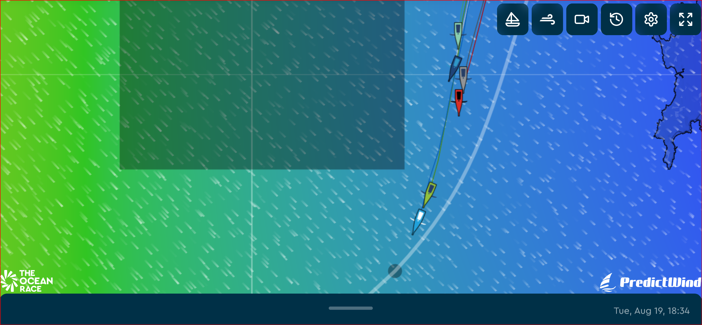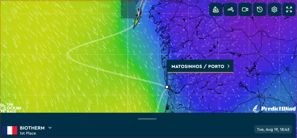 18:34 – Biotherm und Holcim befinden sich kurz vor dem Wegepunkt, an dem sie nach Westen abdrehen müssen, um dort einen weiteren Wegepunkt zu runden. Möglicherweise erreichen sie das Gate bei Porto also am Mittwoch bei Tageslicht.